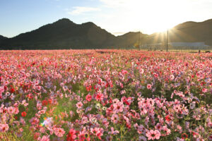 コスモス畑に差し込む朝日の光芒